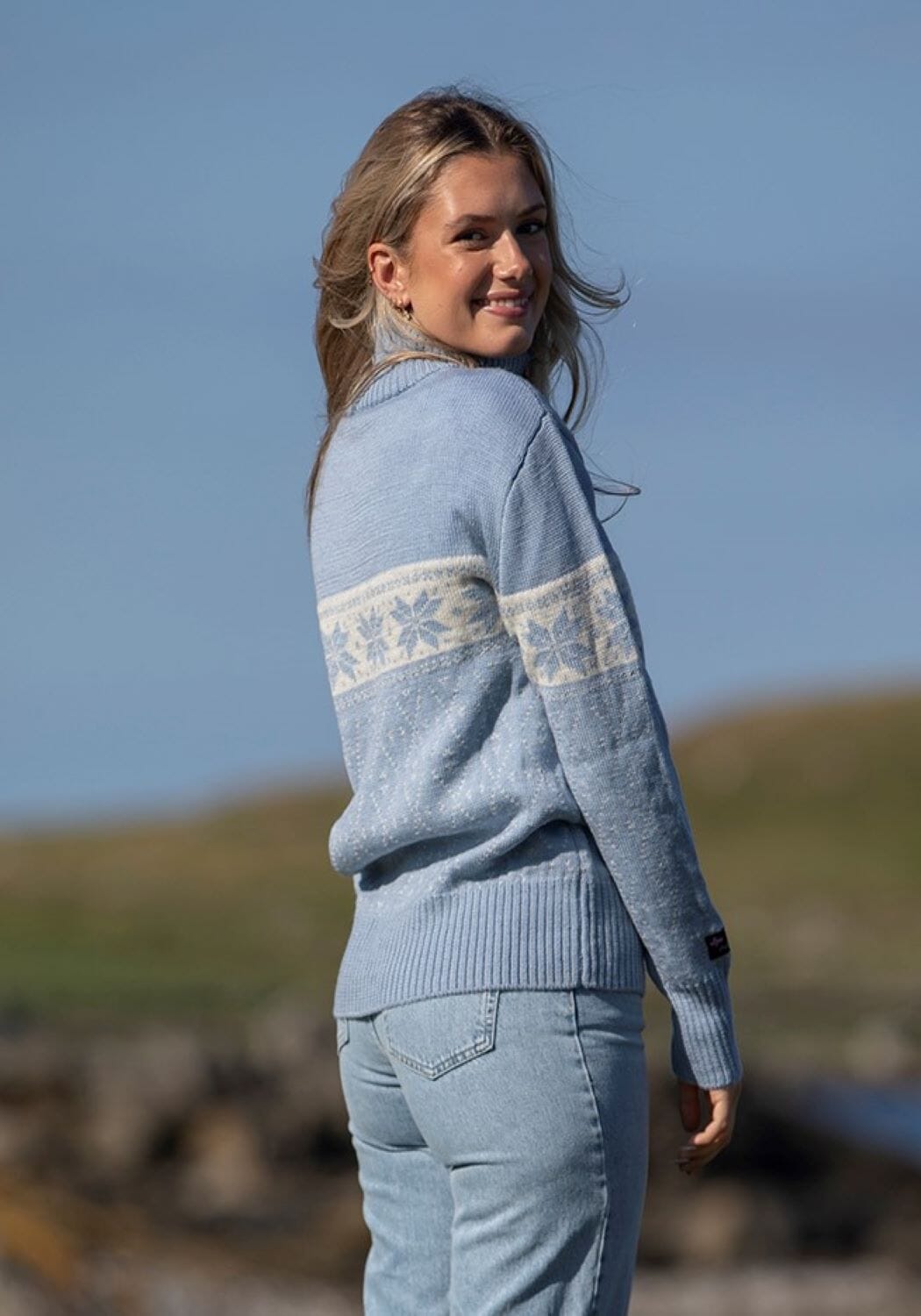 Viking Snø Ullgenser med sitt flotte snøkrystall design, er en nydelig genser som tar tankene til snødekte flater, ski og tur i norsk natur.