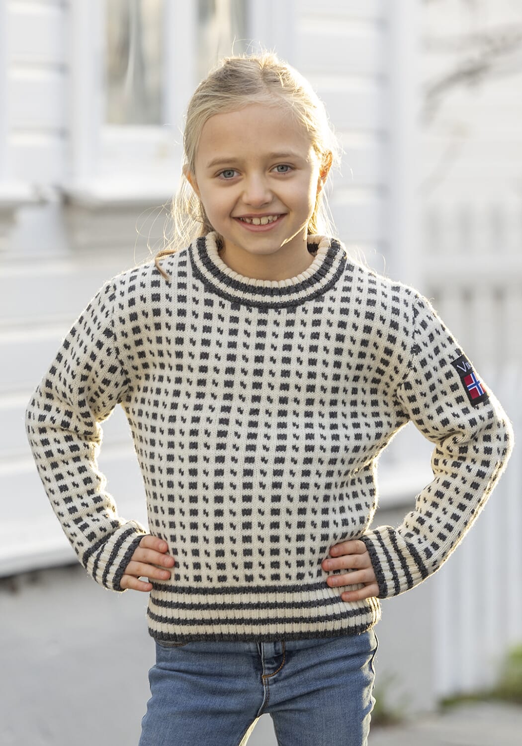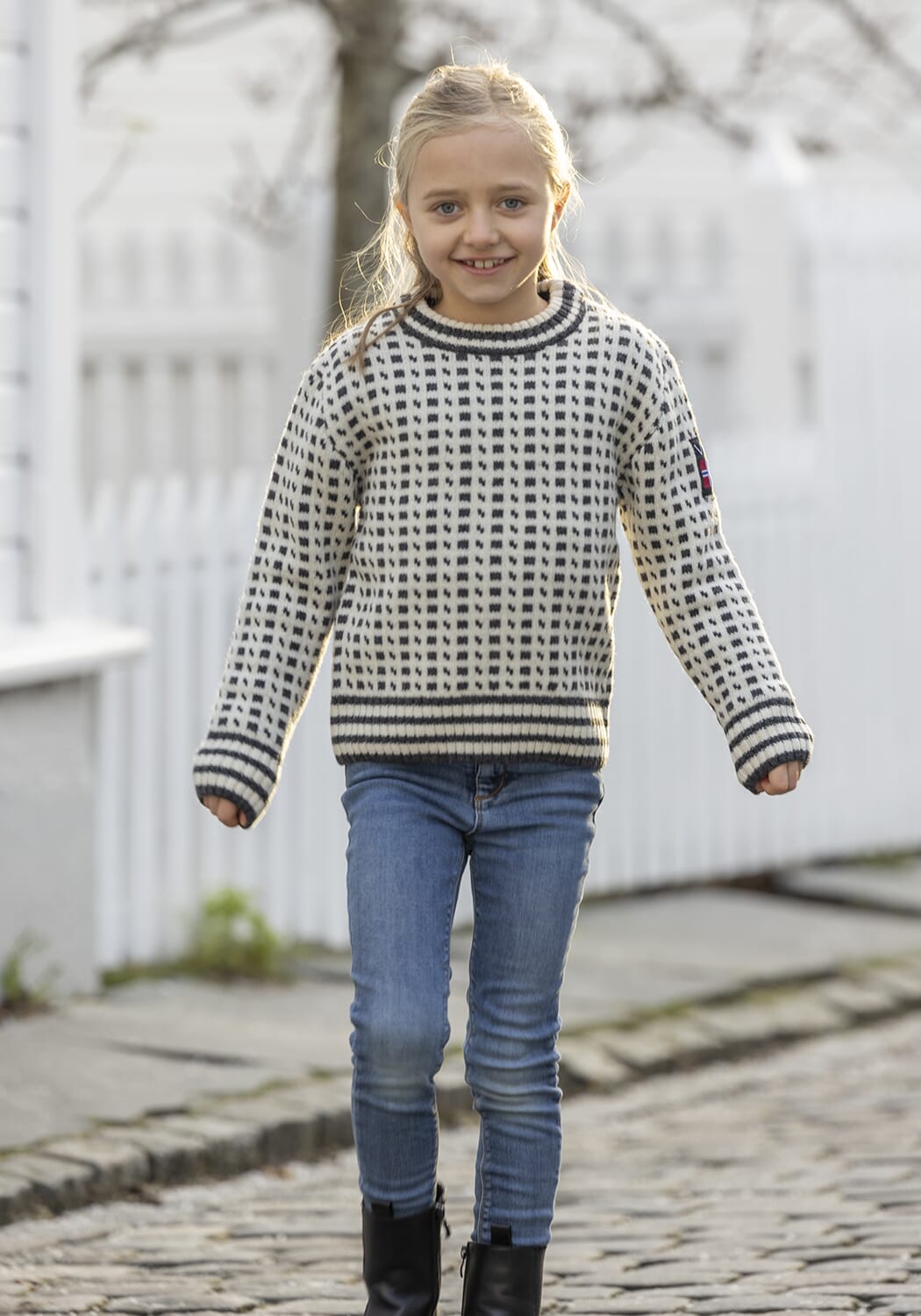 Modellen er 7 år, 125 cm og bruker størrelse 6 år på bildet.