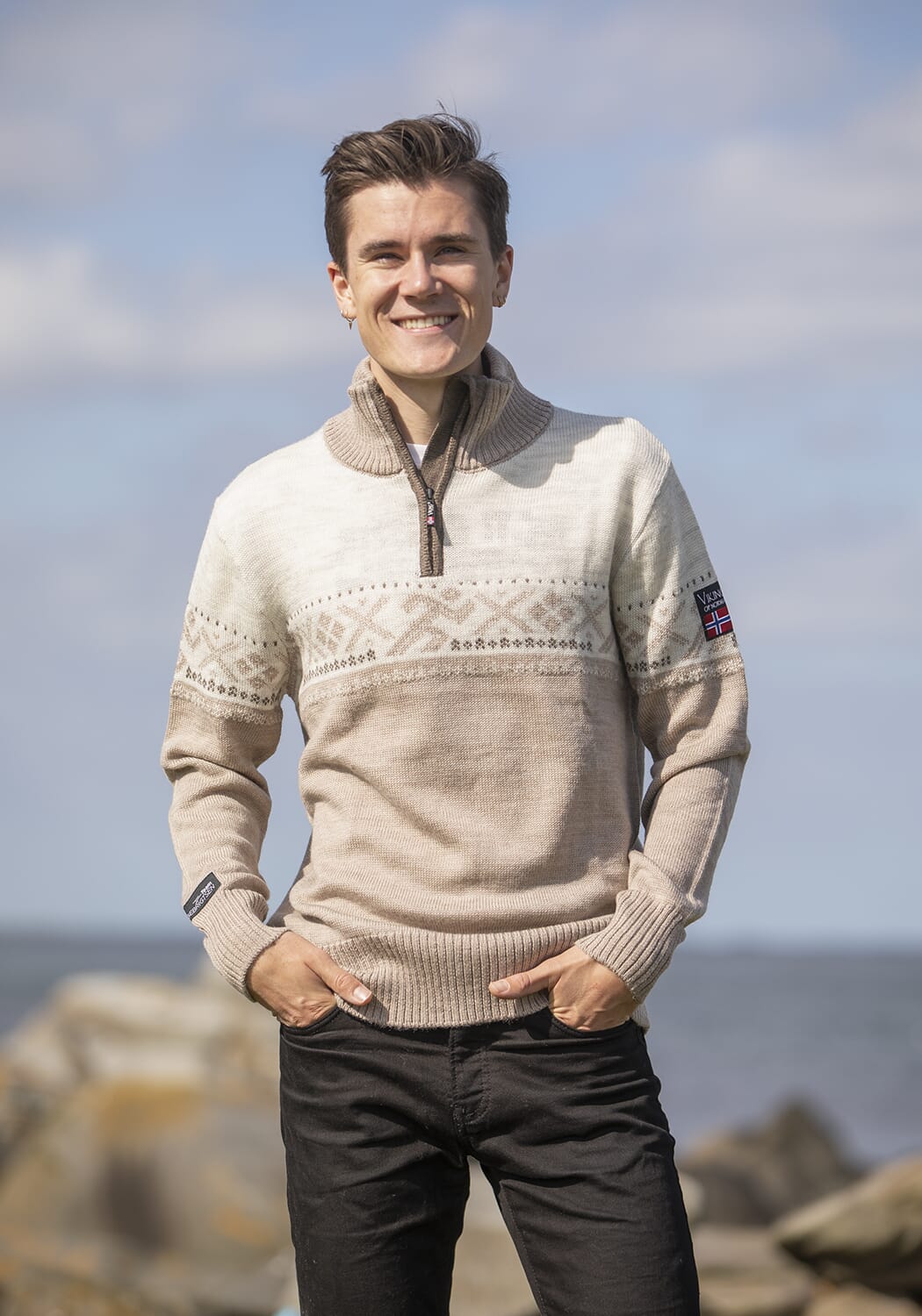 Springeren Ullgenser med mønster over bryst, en nydelig ullgenser i tofarget design med enkelt mønster tvers over brystet. Mønsteret er av Springeren, et design som kom fram i samarbeid med Team Ingebrigtsen.