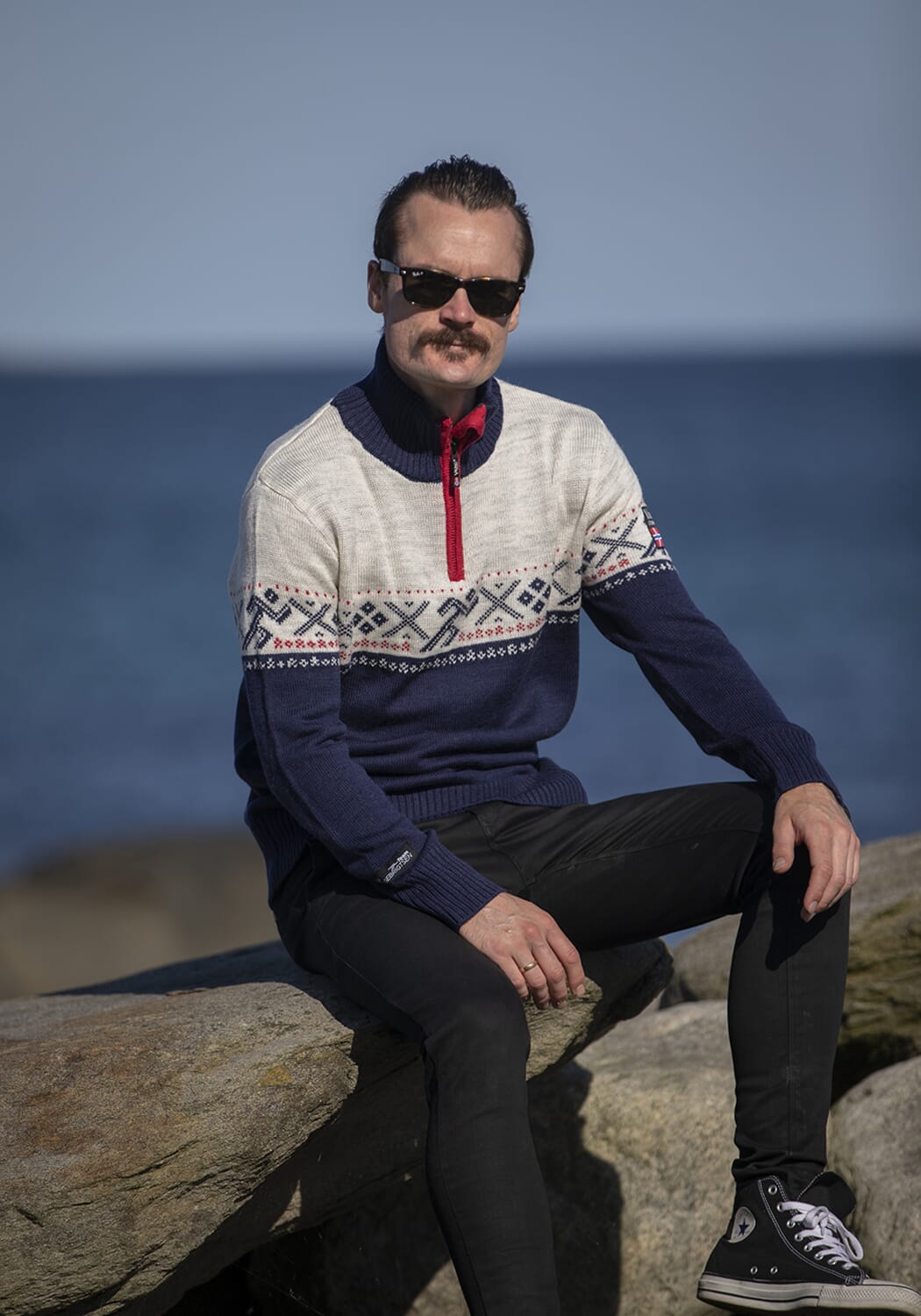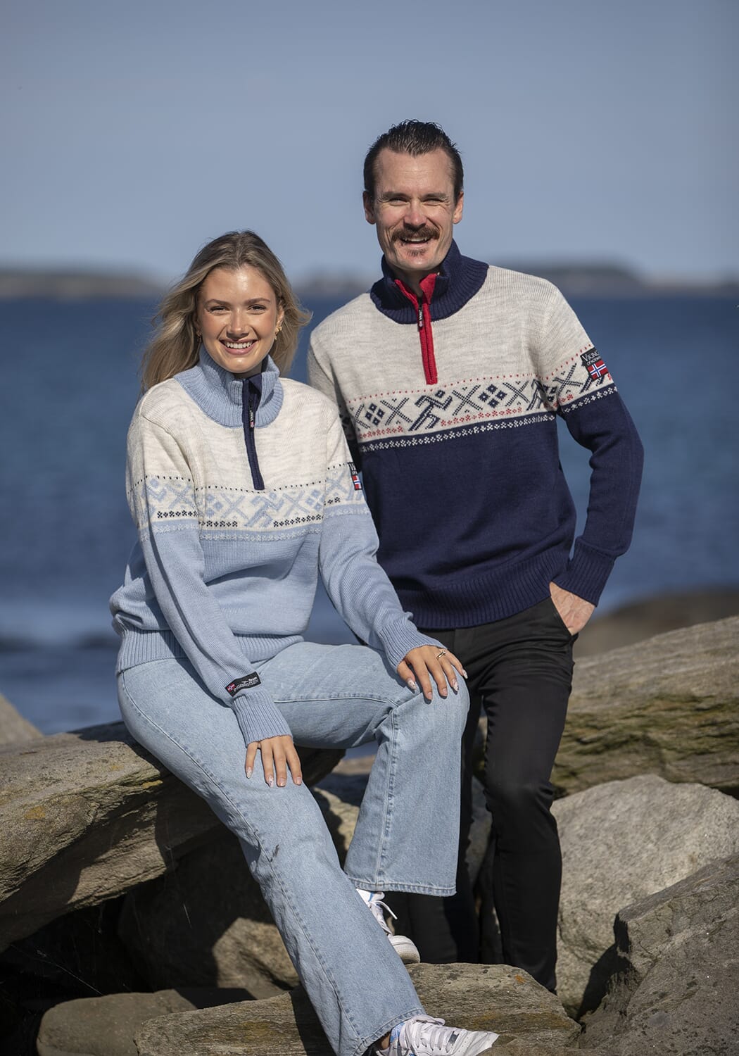 Springeren Ullgenser med mønster over bryst, en nydelig ullgenser i tofarget design med enkelt mønster tvers over brystet. Mønsteret er av Springeren, et design som kom fram i samarbeid med Team Ingebrigtsen.