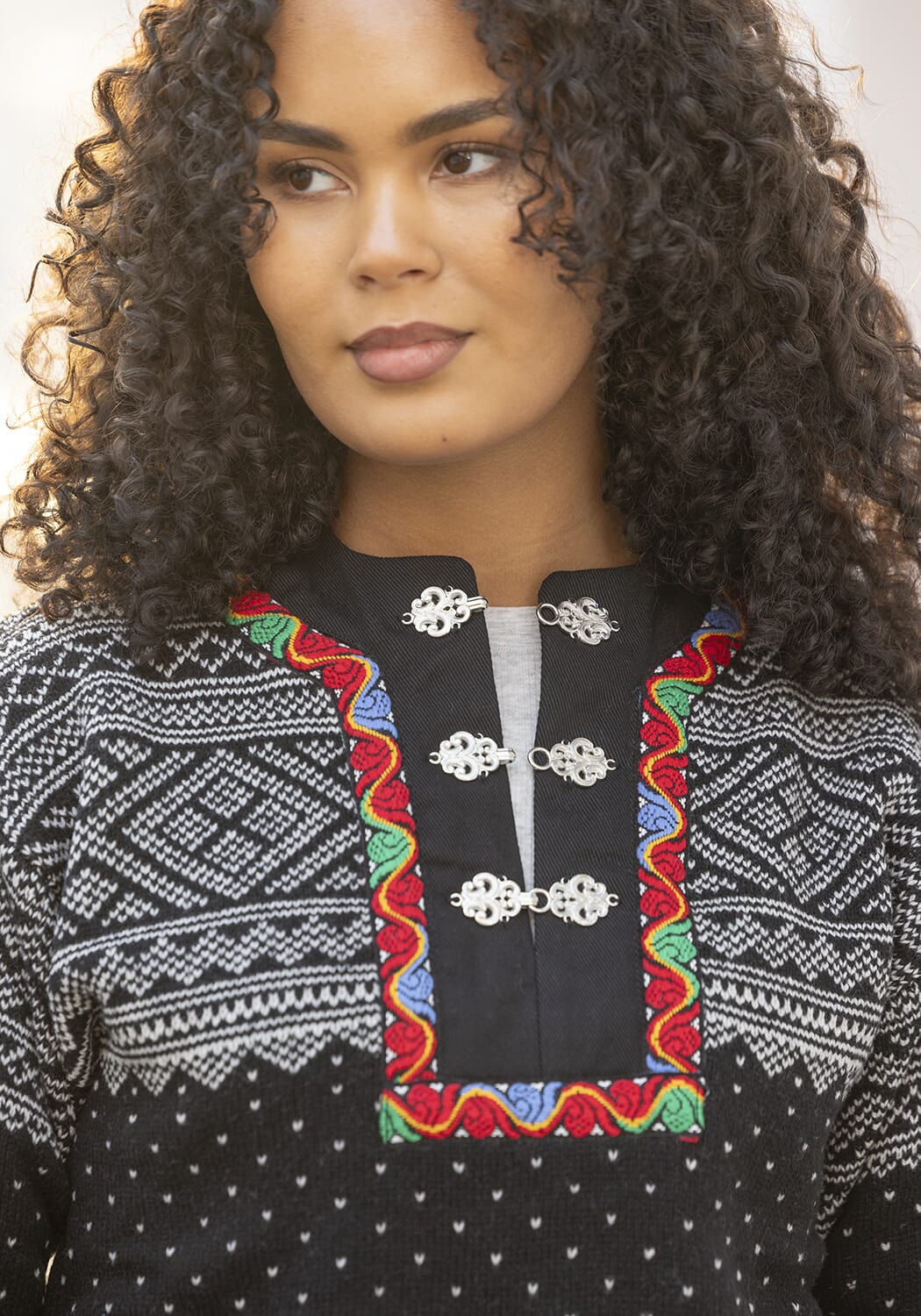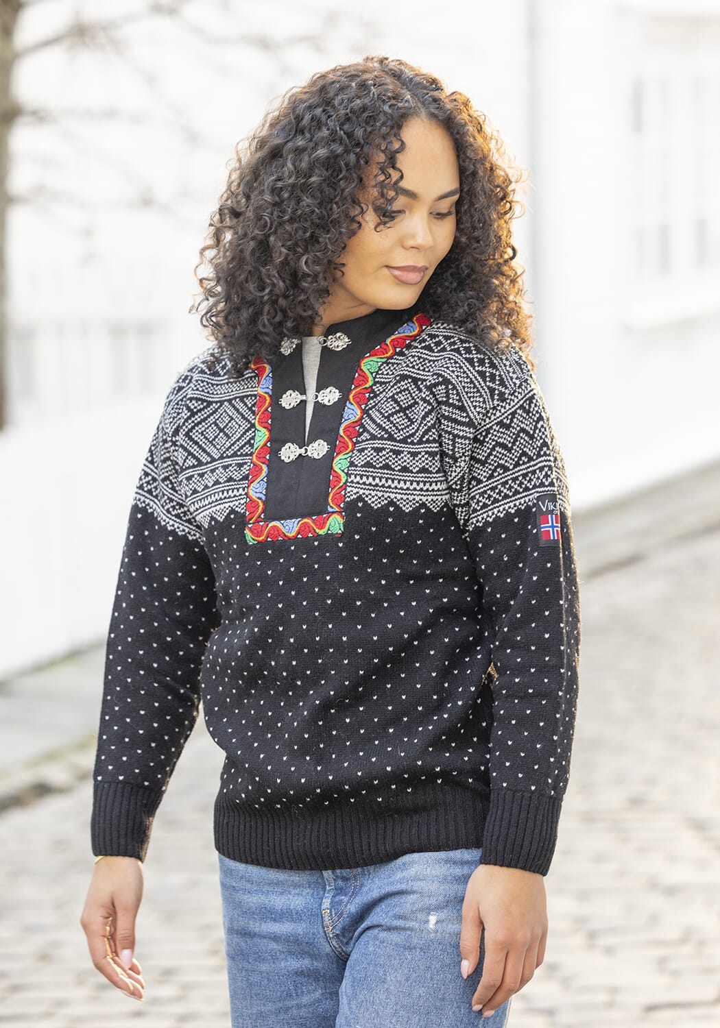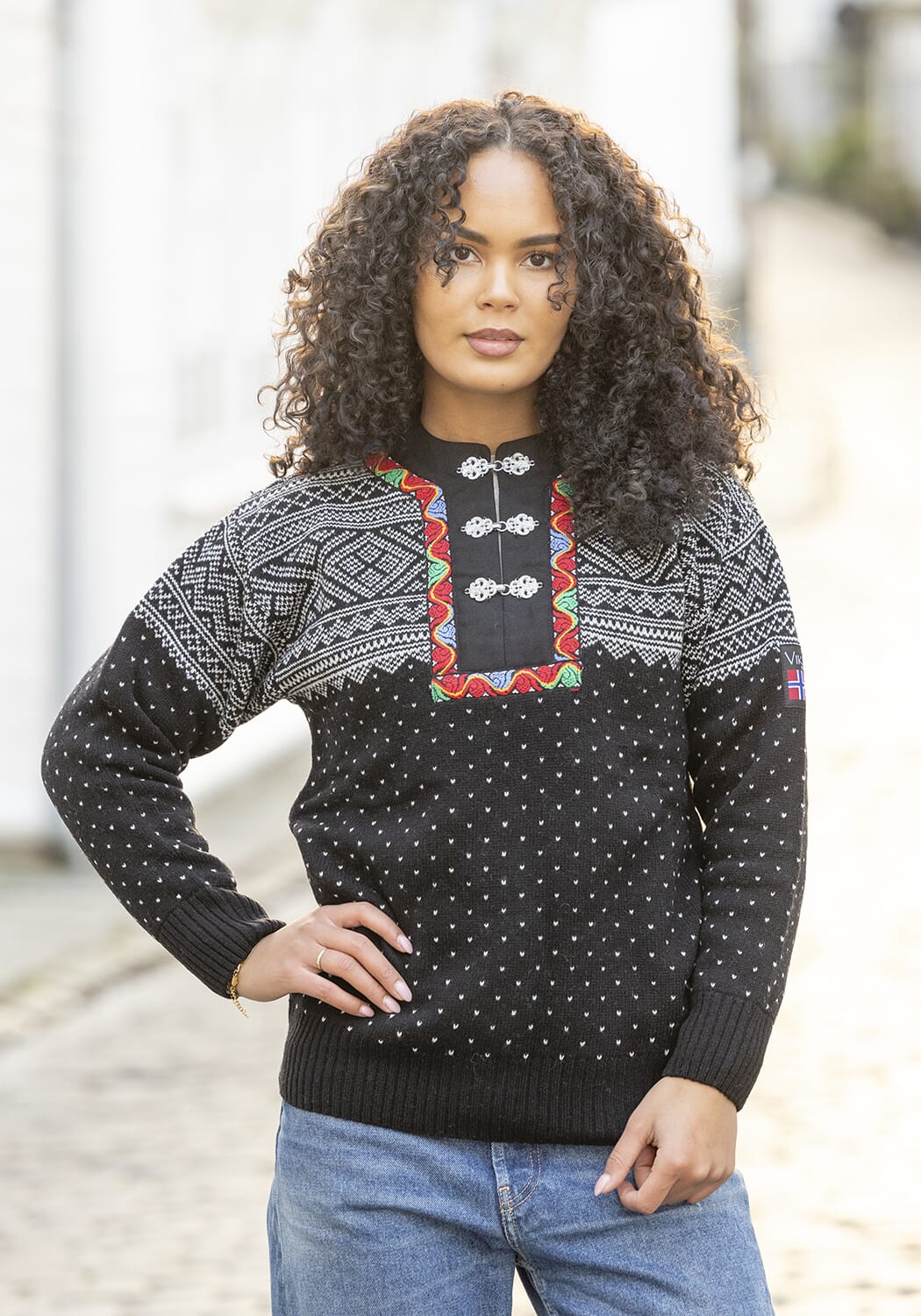 Denne jakken har et klassisk Setesdal-inspirert mønster som gir et elegant og nordisk uttrykk, samtidig som den er praktisk og allsidig i bruk.