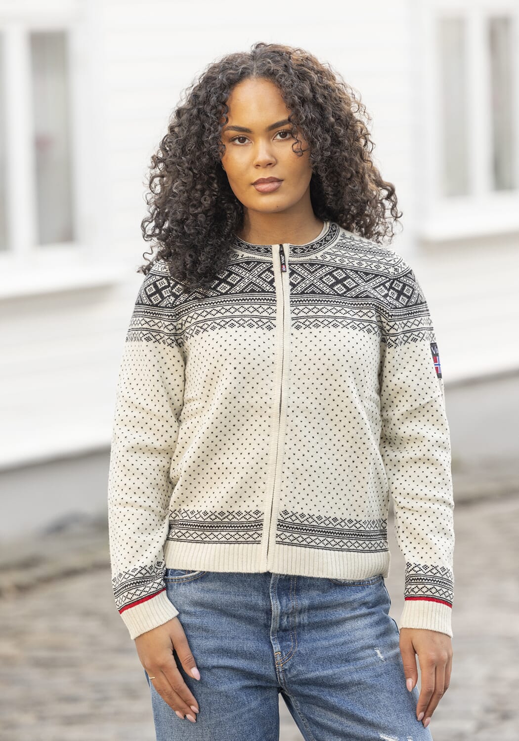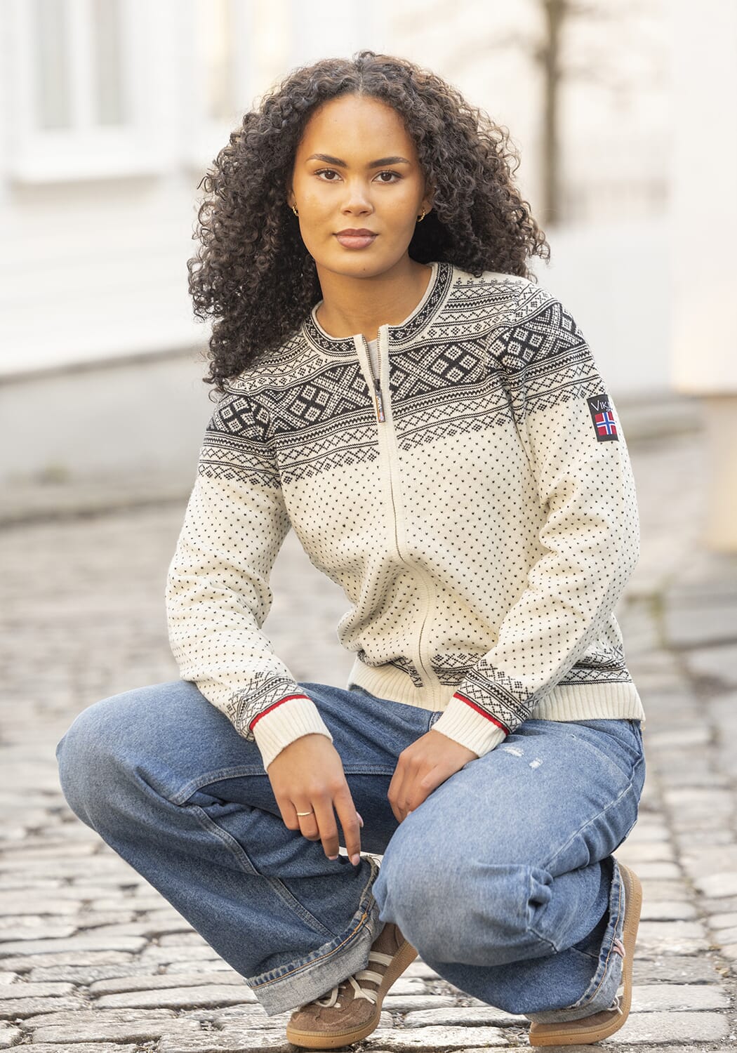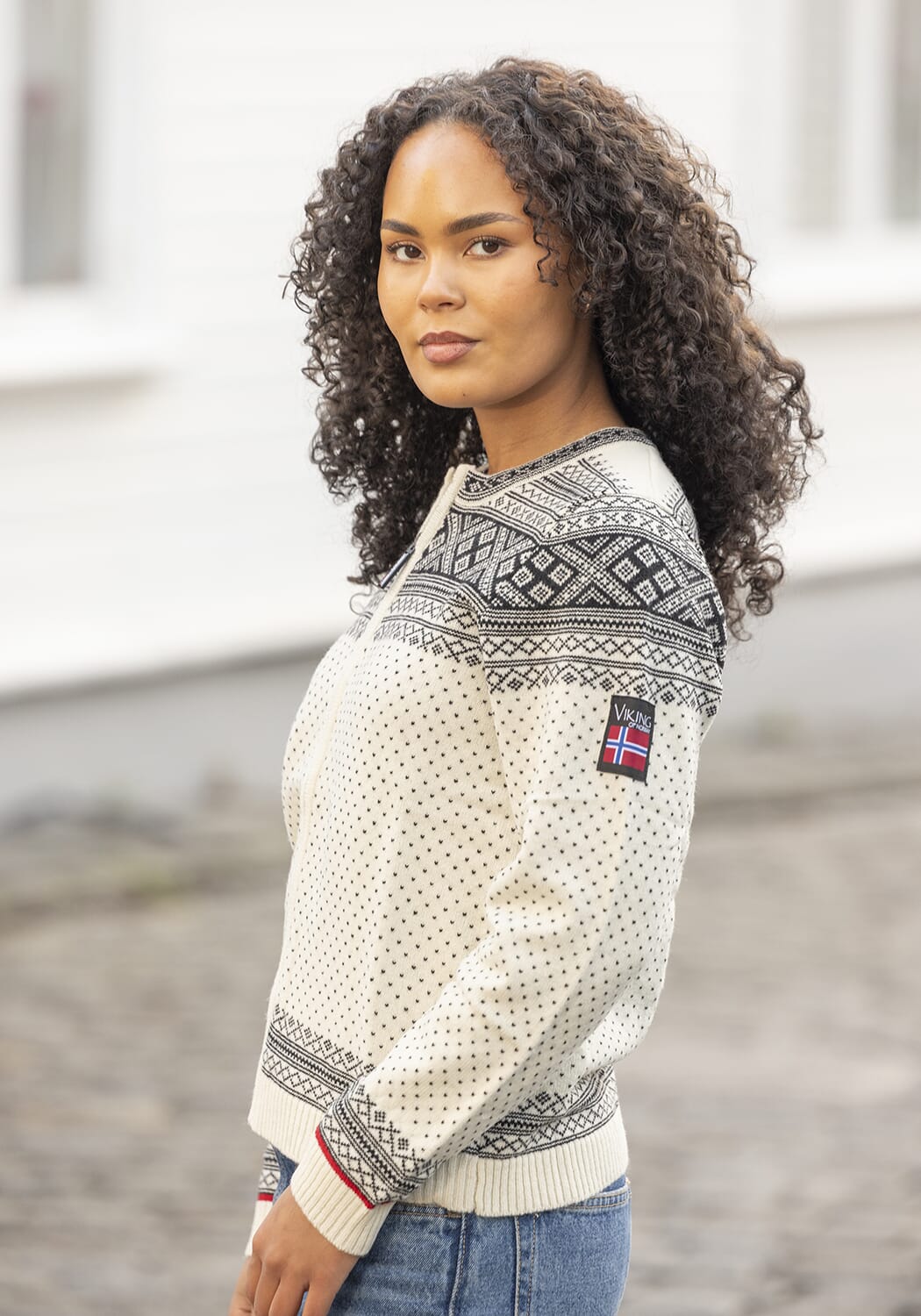 Jakken har et tradisjonelt Setesdal-mønster med et moderne uttrykk og praktisk glidelås i front, som gjør den enkel å ta av og på.