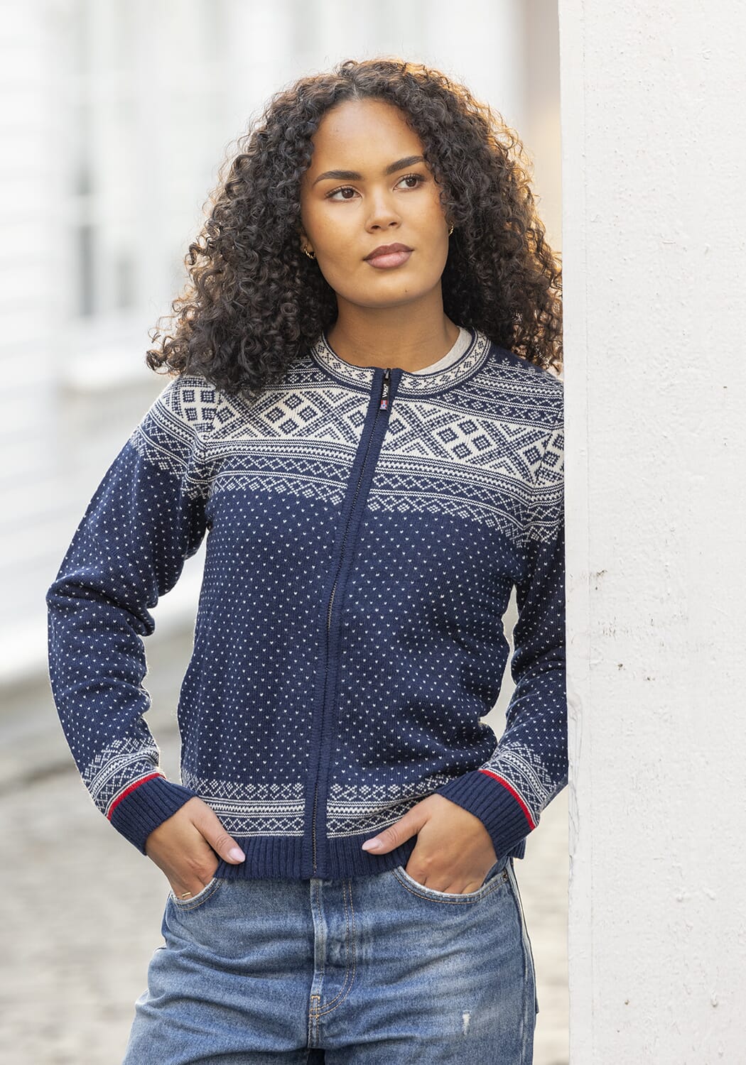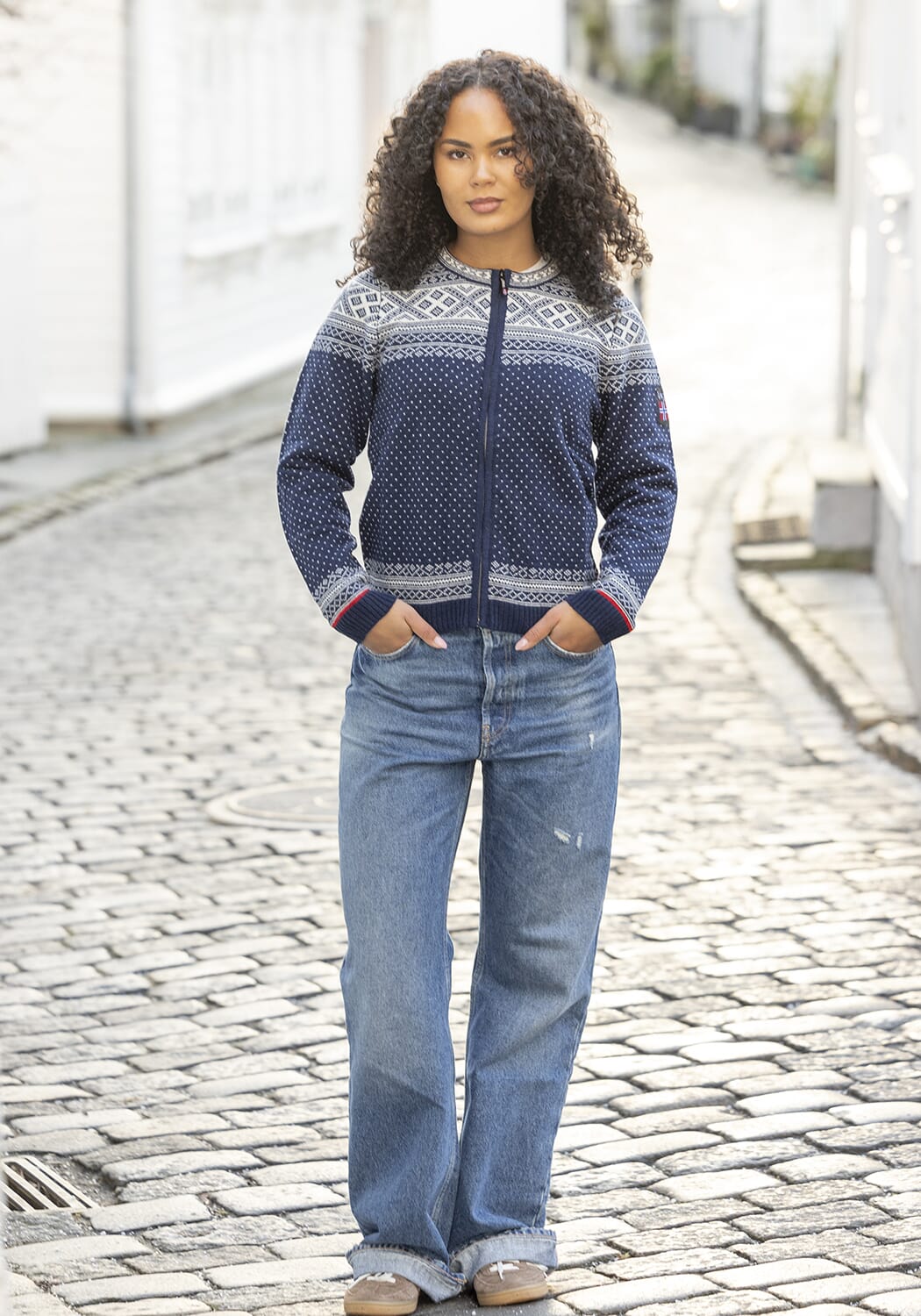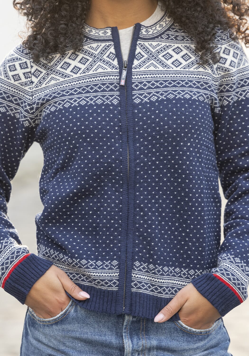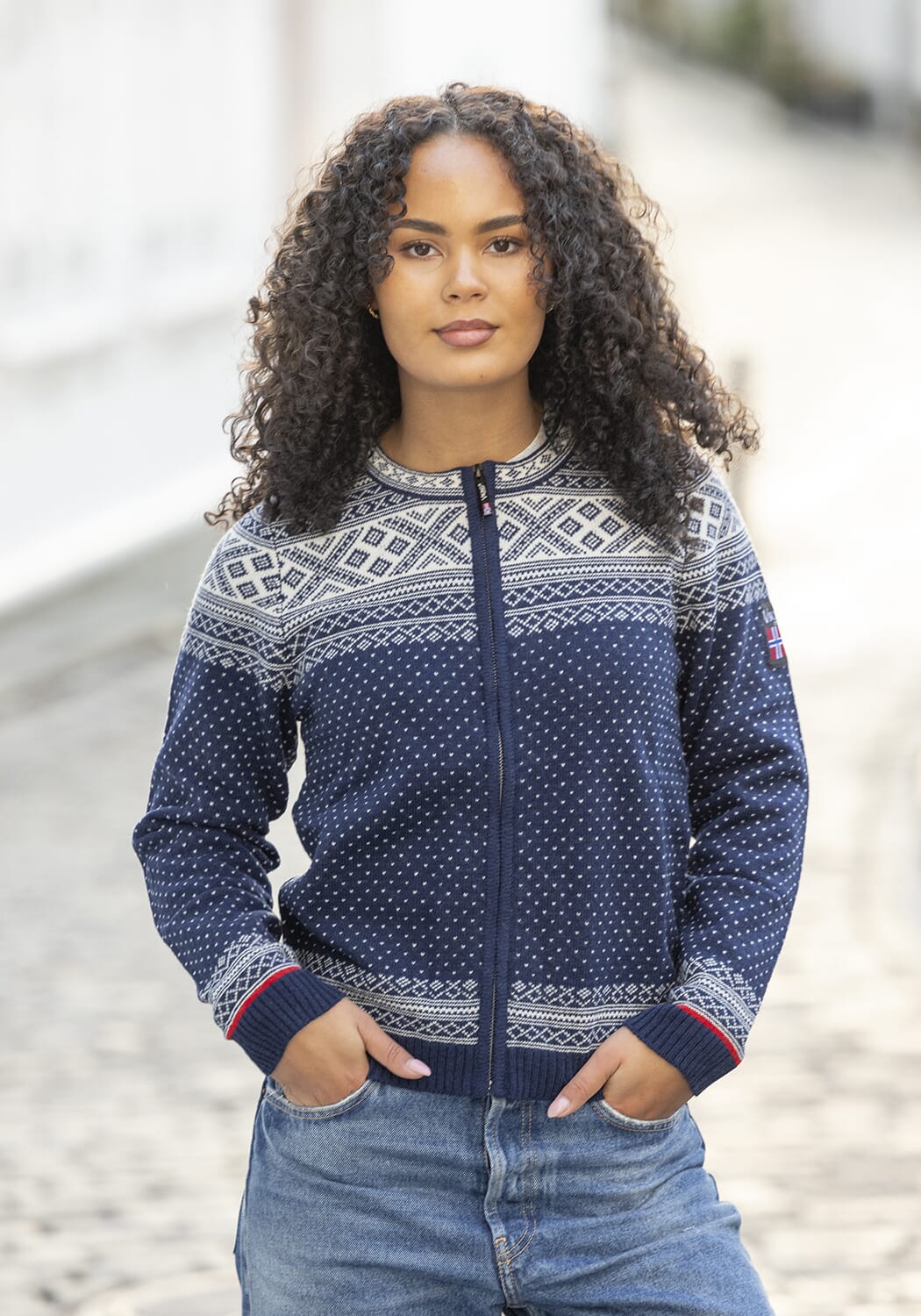 Jakken har et tradisjonelt Setesdal-mønster med et moderne uttrykk og praktisk glidelås i front, som gjør den enkel å ta av og på.
